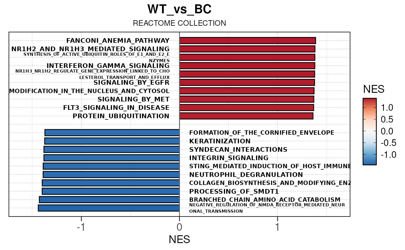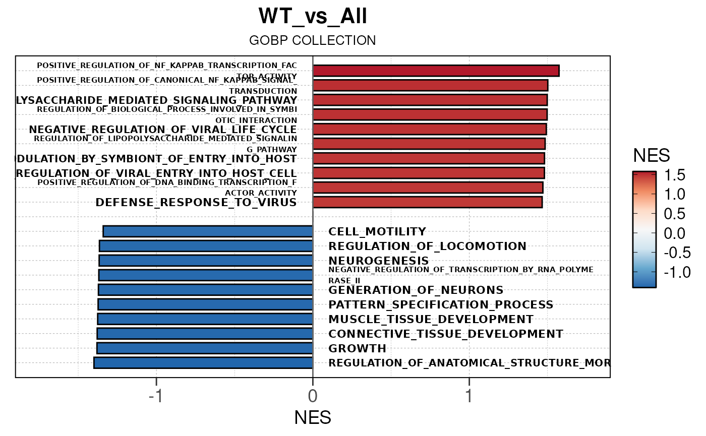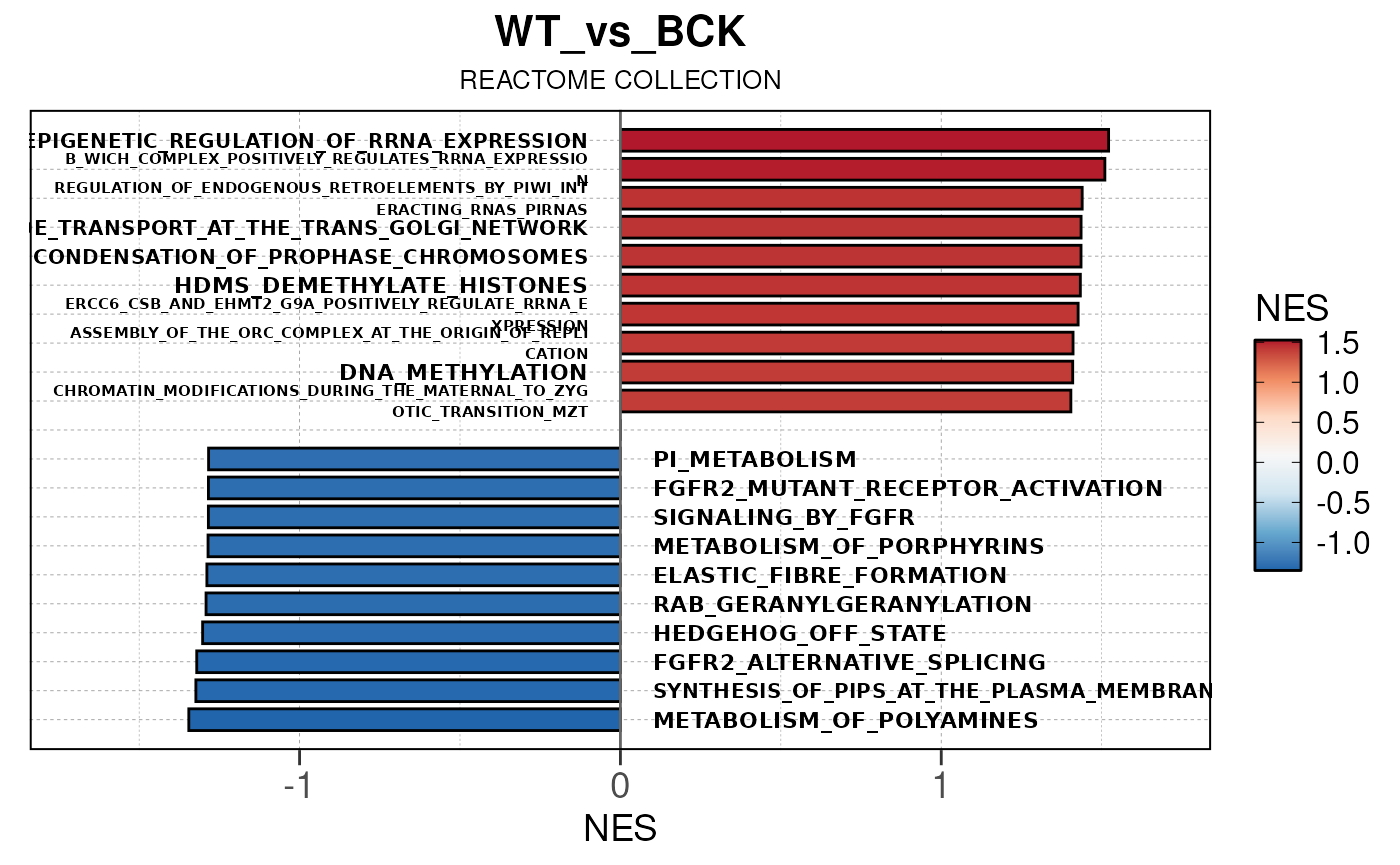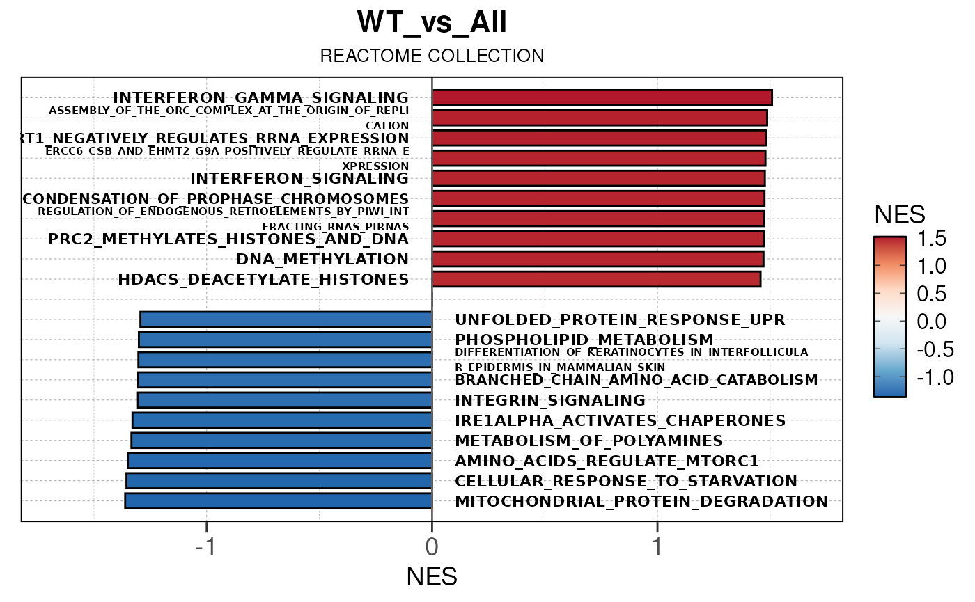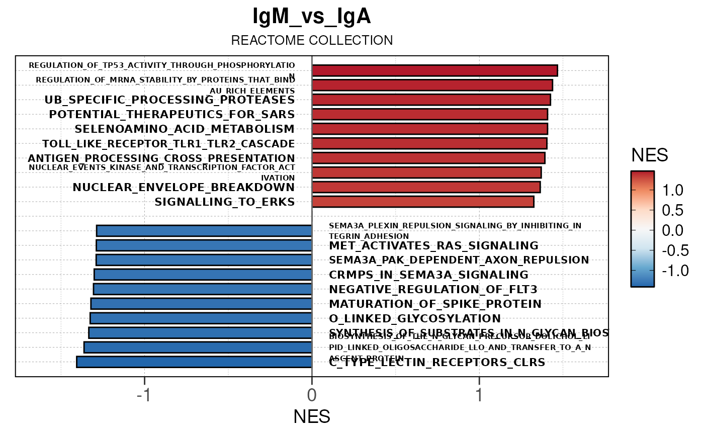 ## WARNING: There were 2 pathways for which P-values were not calculated properly due to unbalanced (positive and negative) gene-level statistic values. For such pathways pval, padj, NES, log2err are set to NA. You can try to increase the value of the argument nPermSimple (for example set it nPermSimple = 10000)