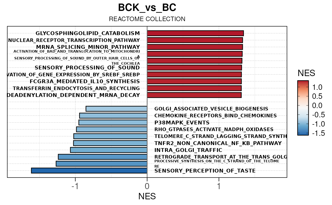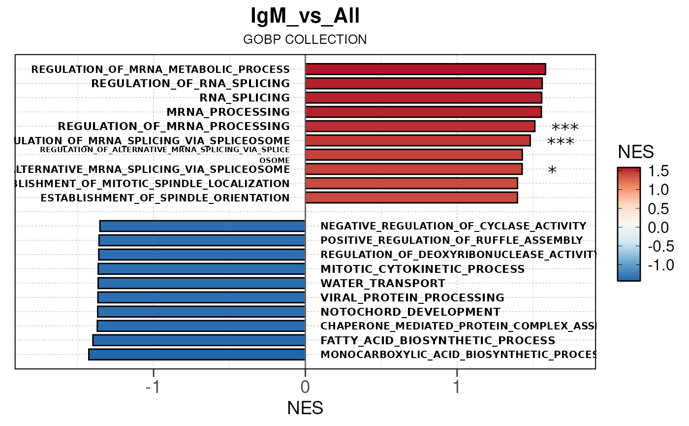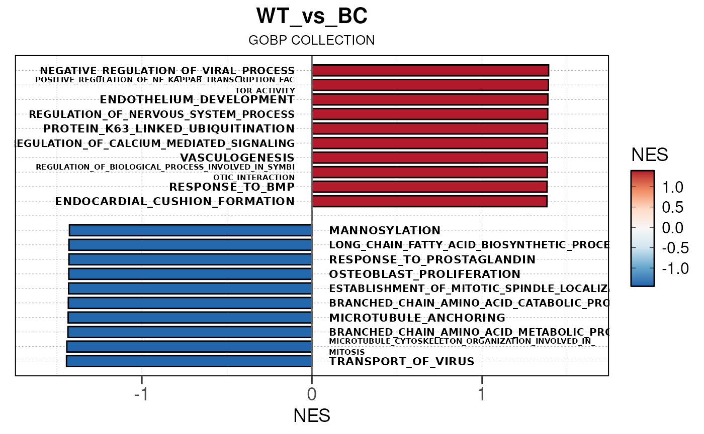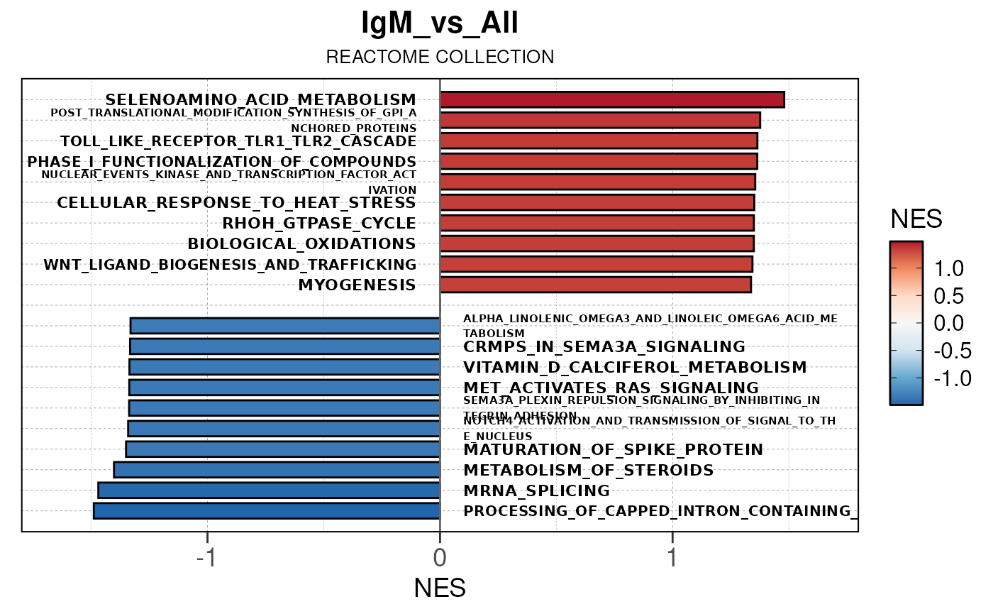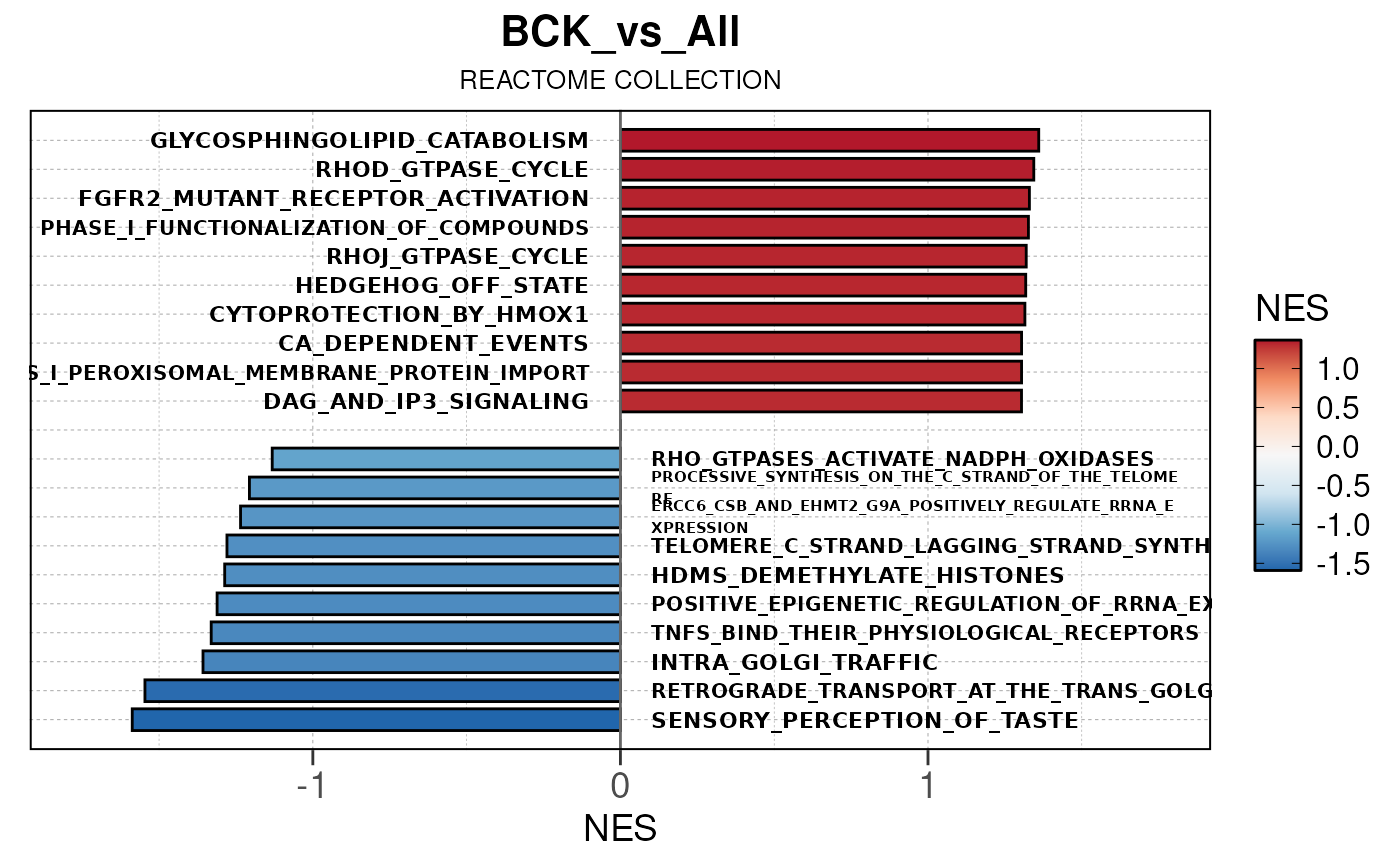 ## WARNING: There were 2 pathways for which P-values were not calculated properly due to unbalanced (positive and negative) gene-level statistic values. For such pathways pval, padj, NES, log2err are set to NA. You can try to increase the value of the argument nPermSimple (for example set it nPermSimple = 10000)