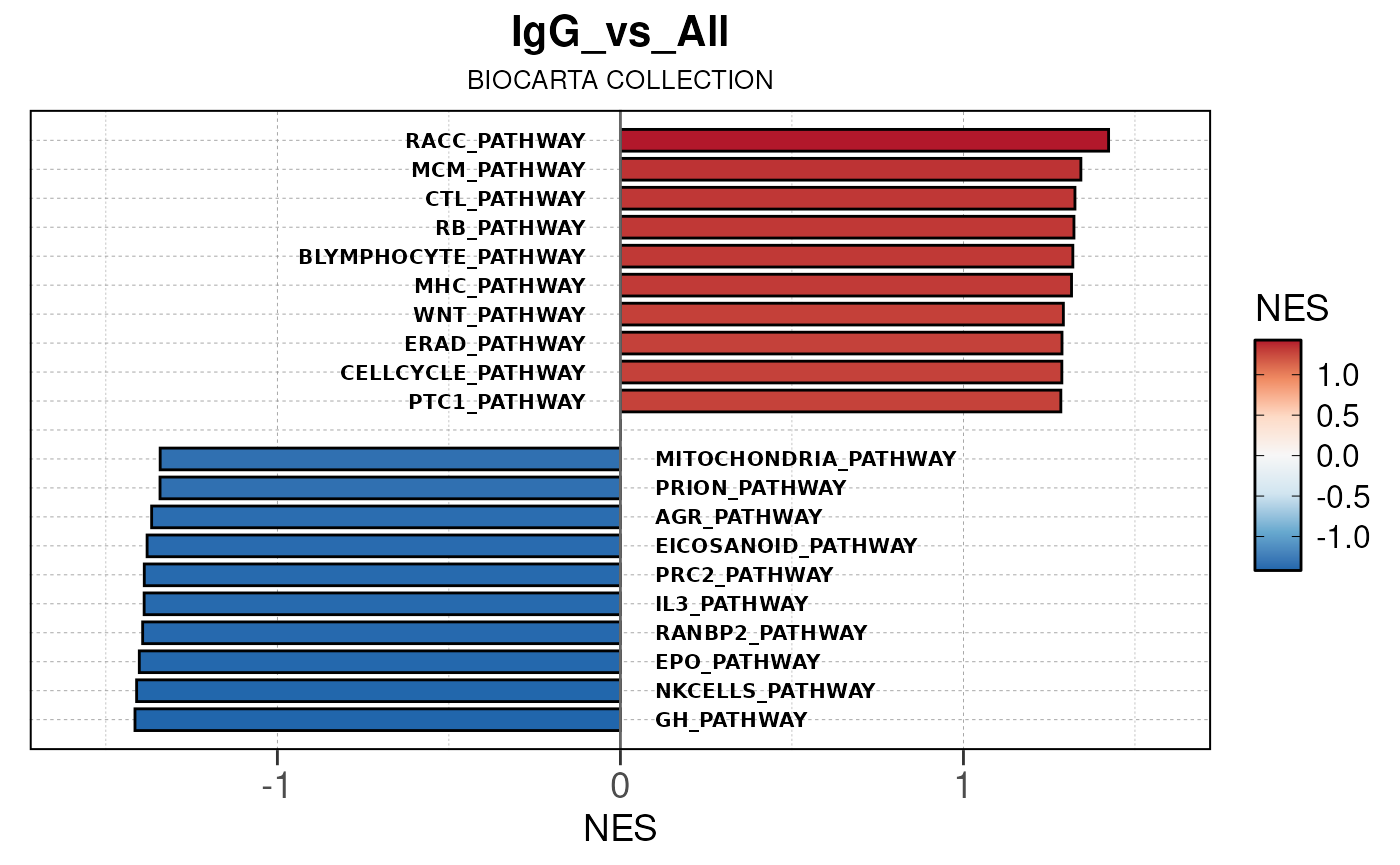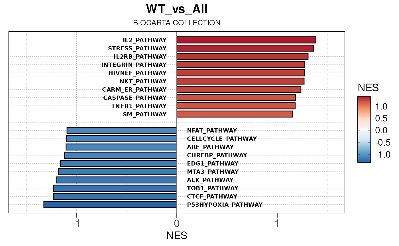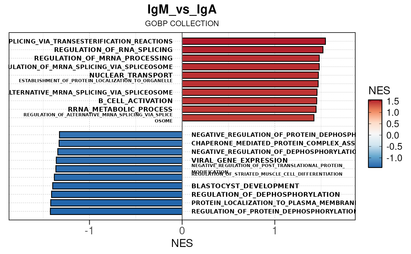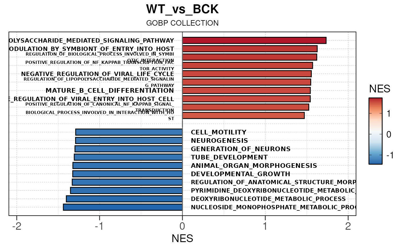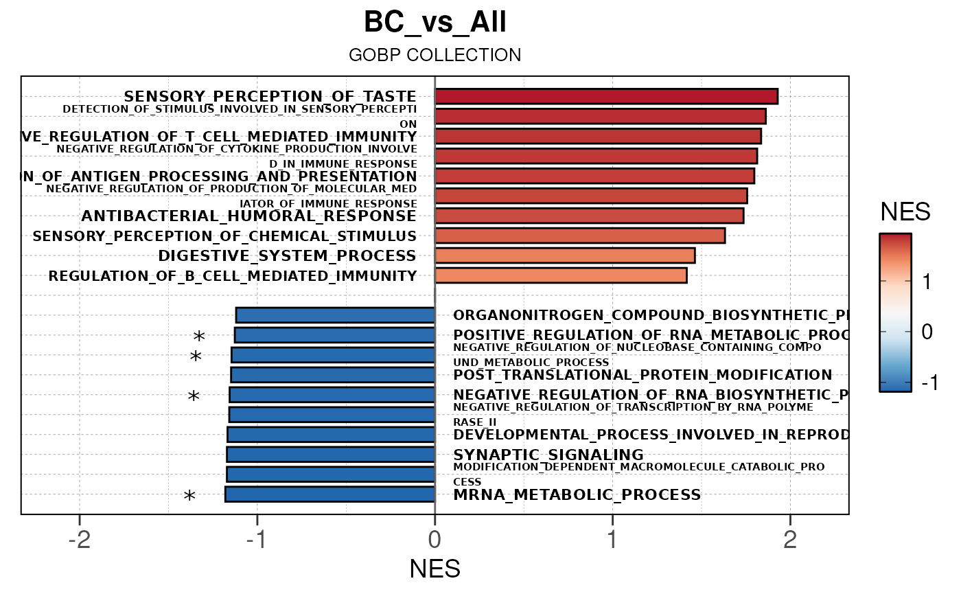 ## WARNING: There were 2 pathways for which P-values were not calculated properly due to unbalanced (positive and negative) gene-level statistic values. For such pathways pval, padj, NES, log2err are set to NA. You can try to increase the value of the argument nPermSimple (for example set it nPermSimple = 10000)