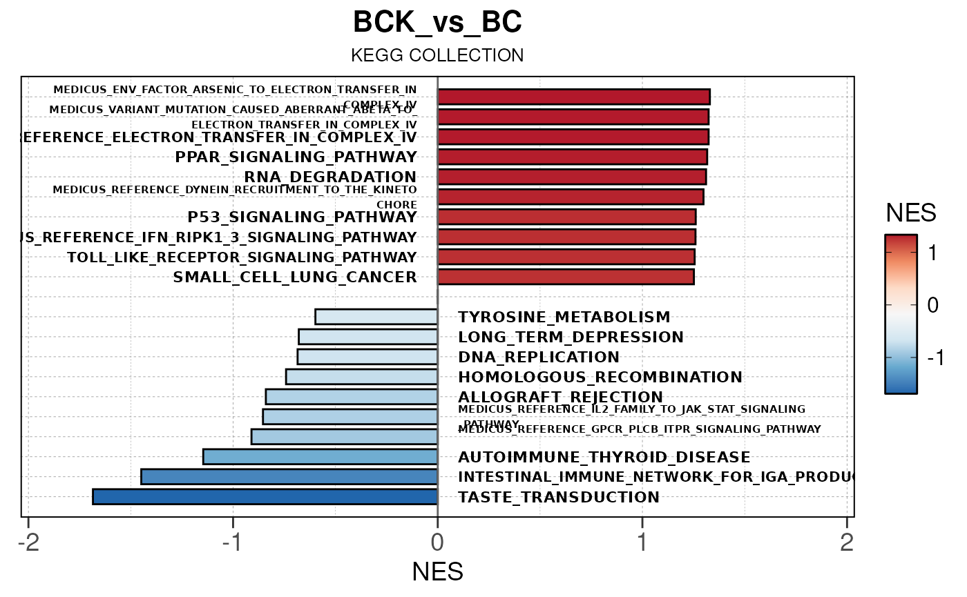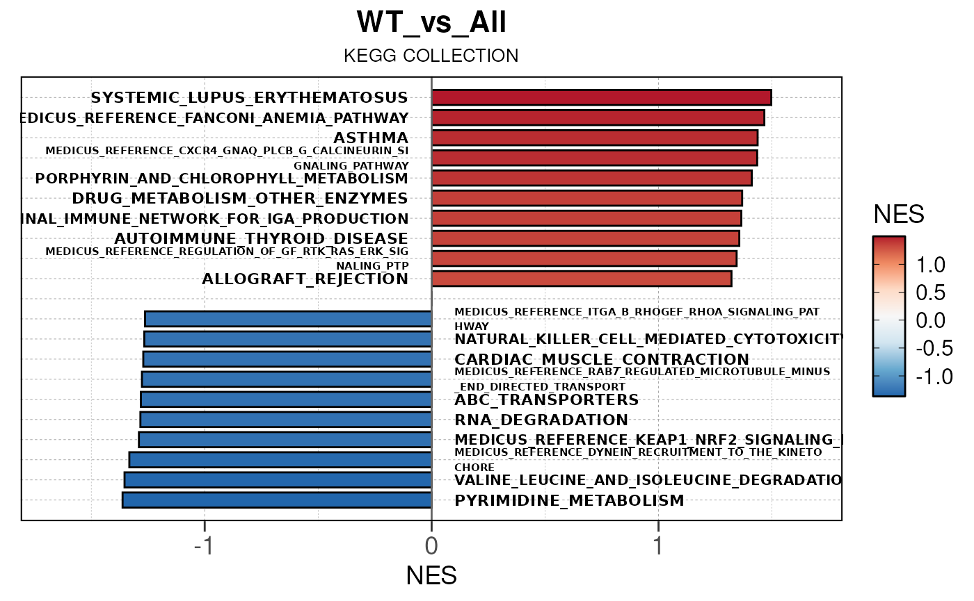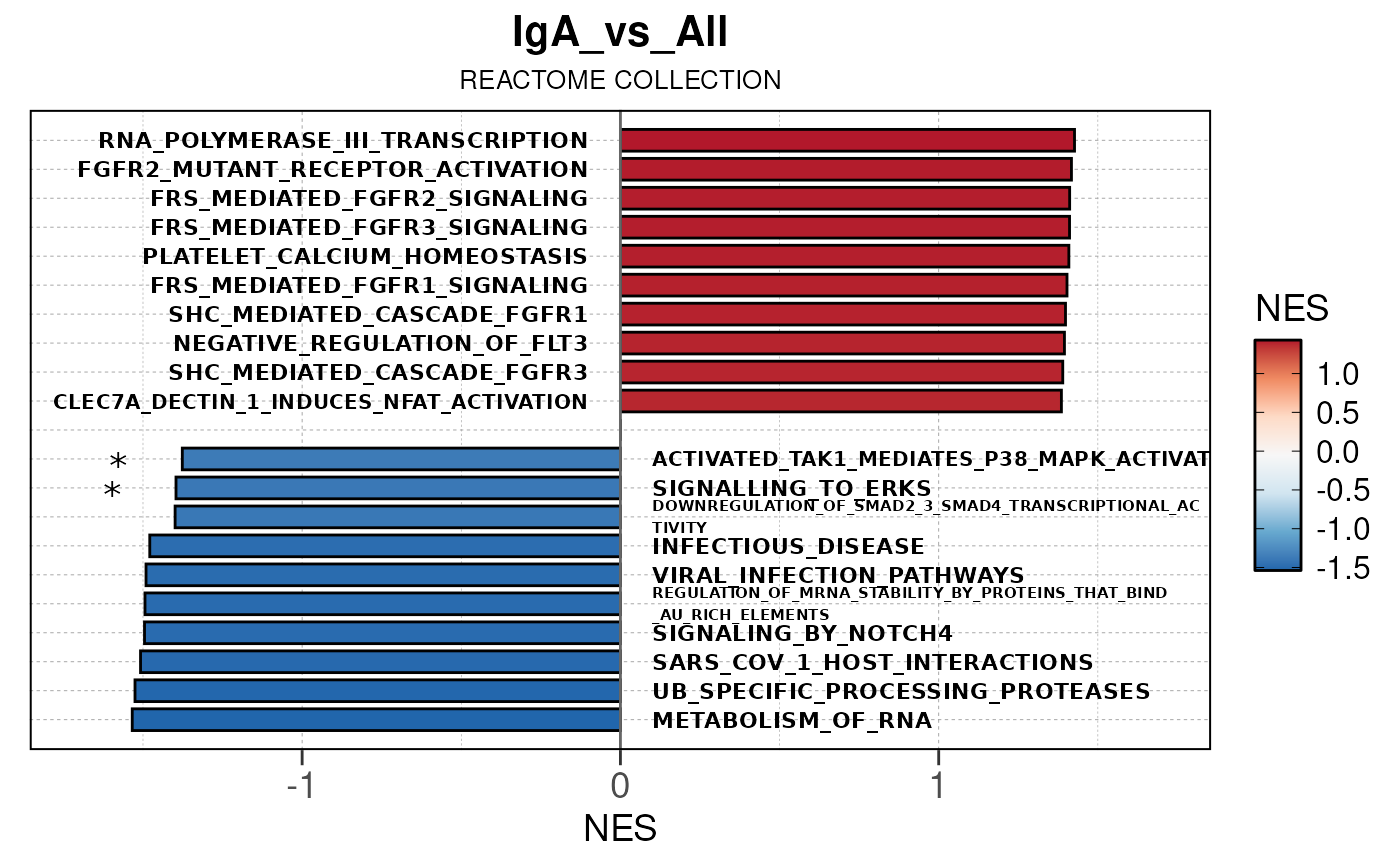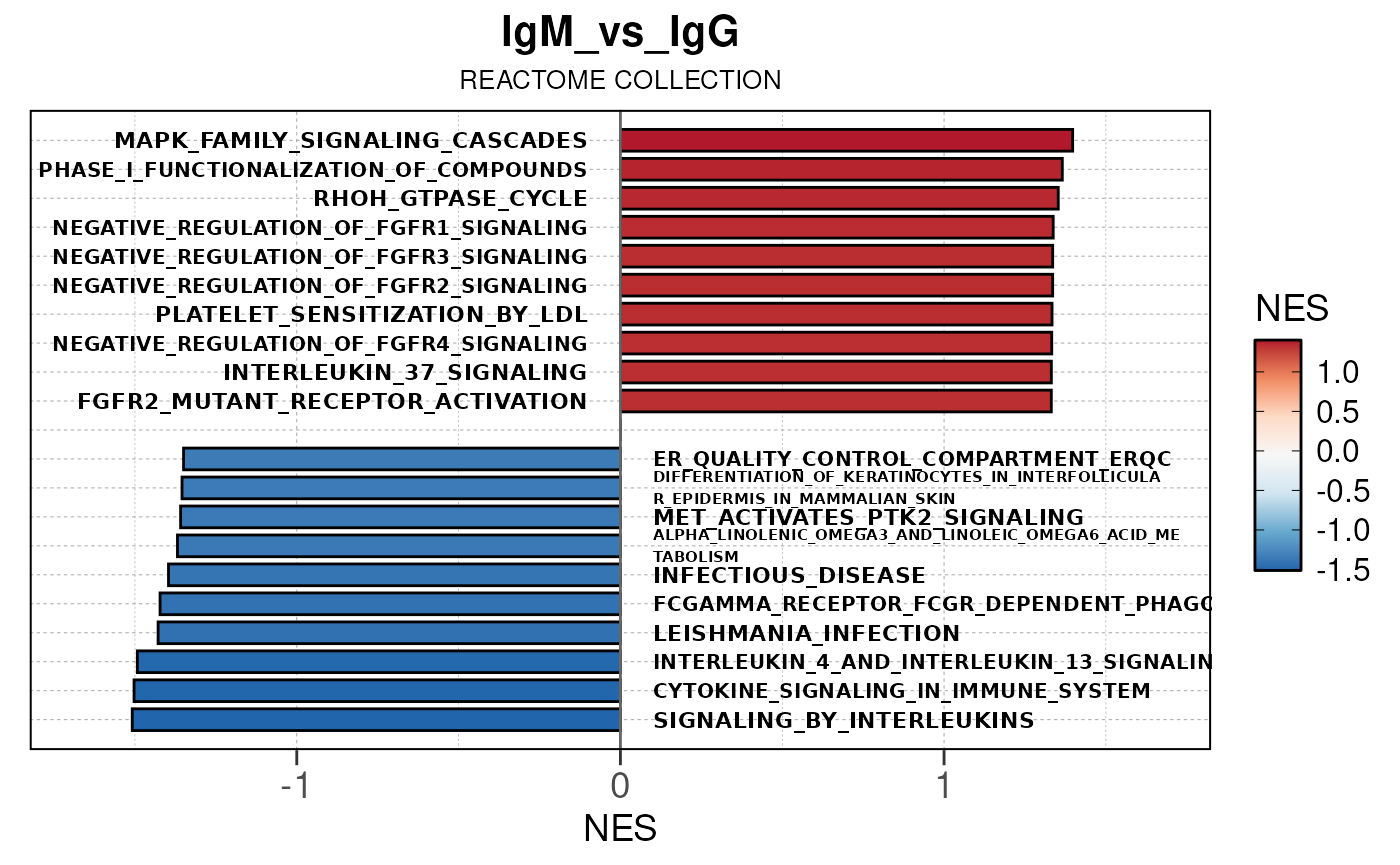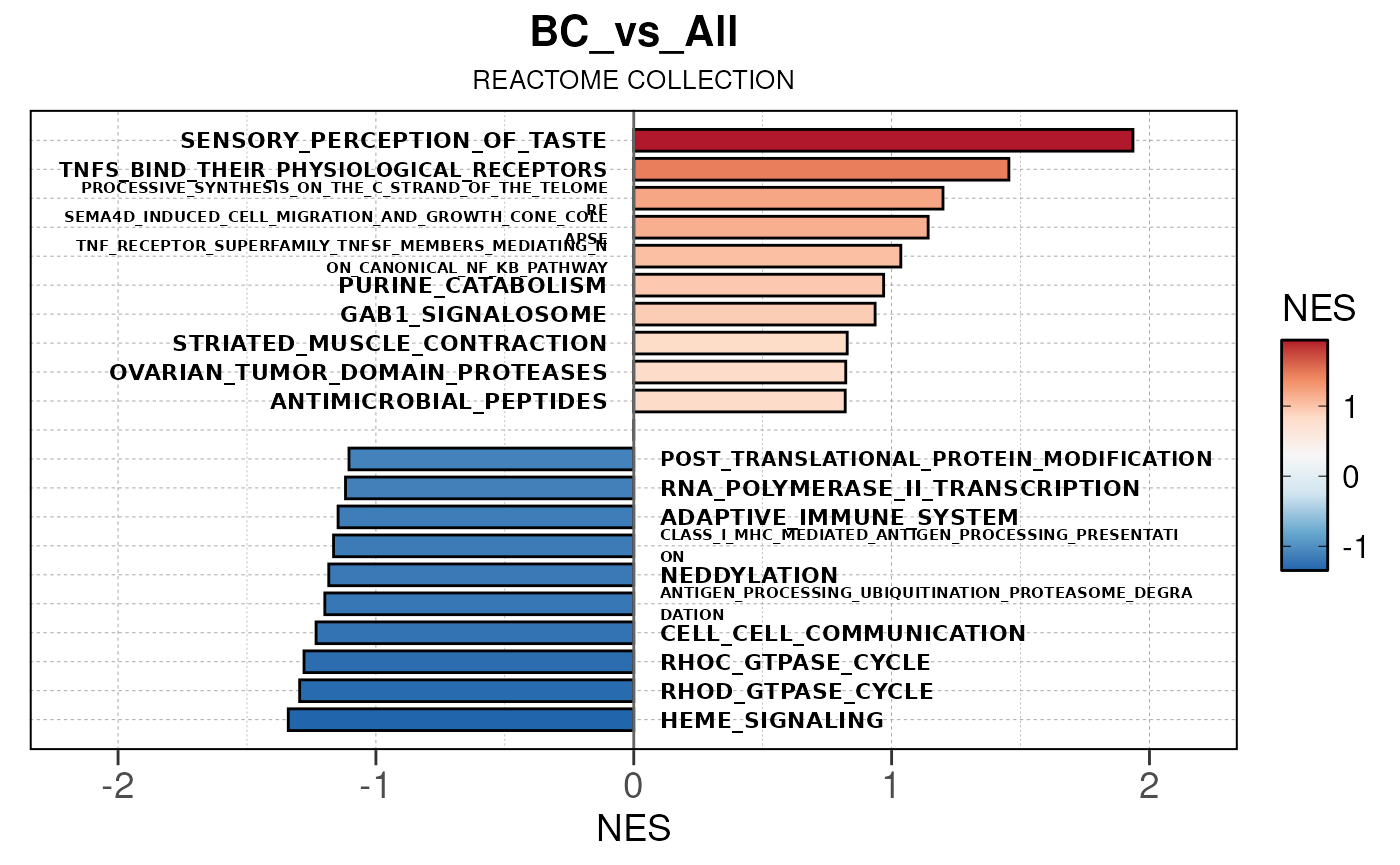 ## WARNING: There were 2 pathways for which P-values were not calculated properly due to unbalanced (positive and negative) gene-level statistic values. For such pathways pval, padj, NES, log2err are set to NA. You can try to increase the value of the argument nPermSimple (for example set it nPermSimple = 10000)