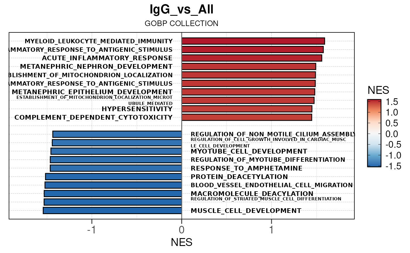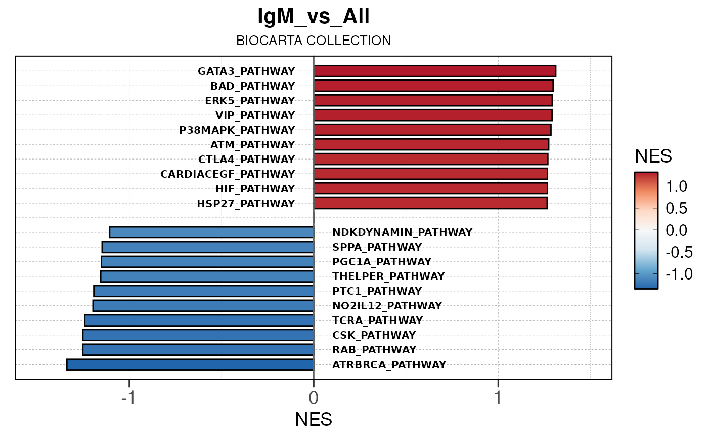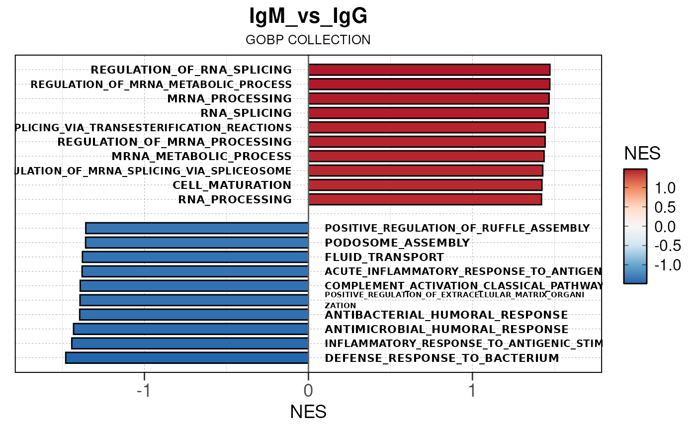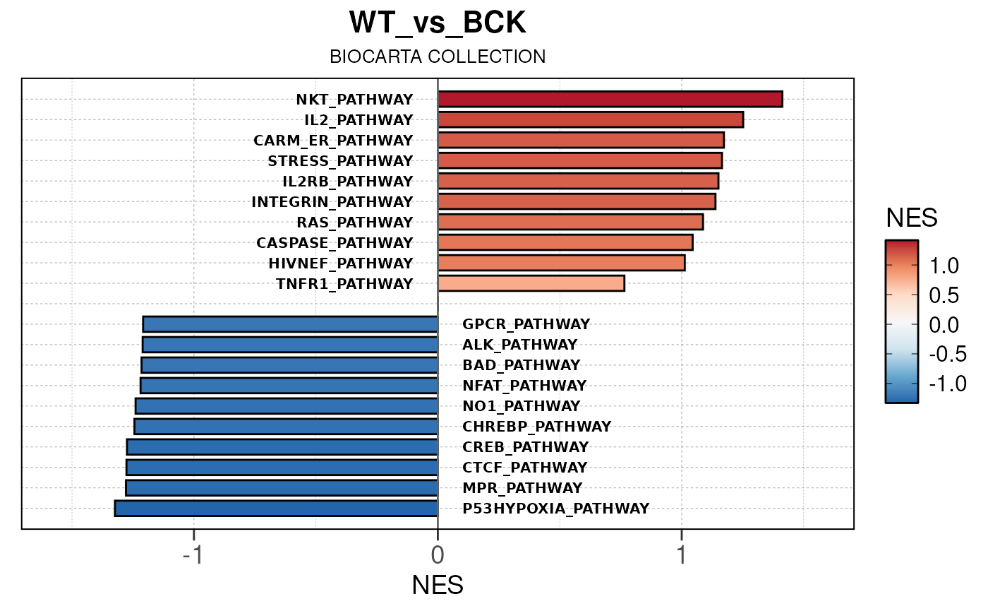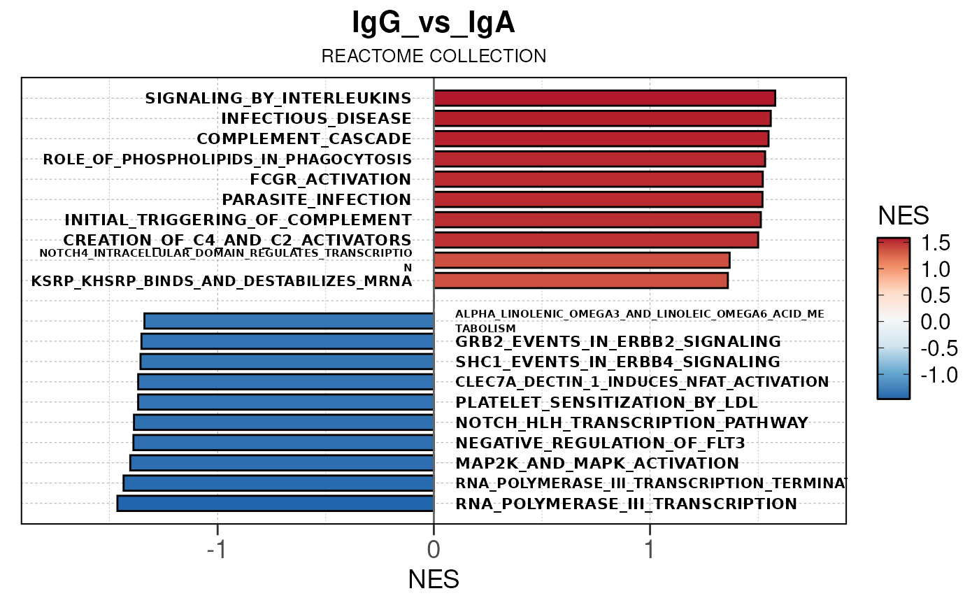 ## WARNING: There were 2 pathways for which P-values were not calculated properly due to unbalanced (positive and negative) gene-level statistic values. For such pathways pval, padj, NES, log2err are set to NA. You can try to increase the value of the argument nPermSimple (for example set it nPermSimple = 10000)