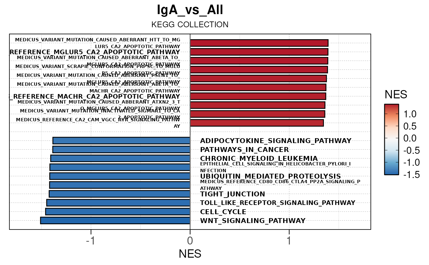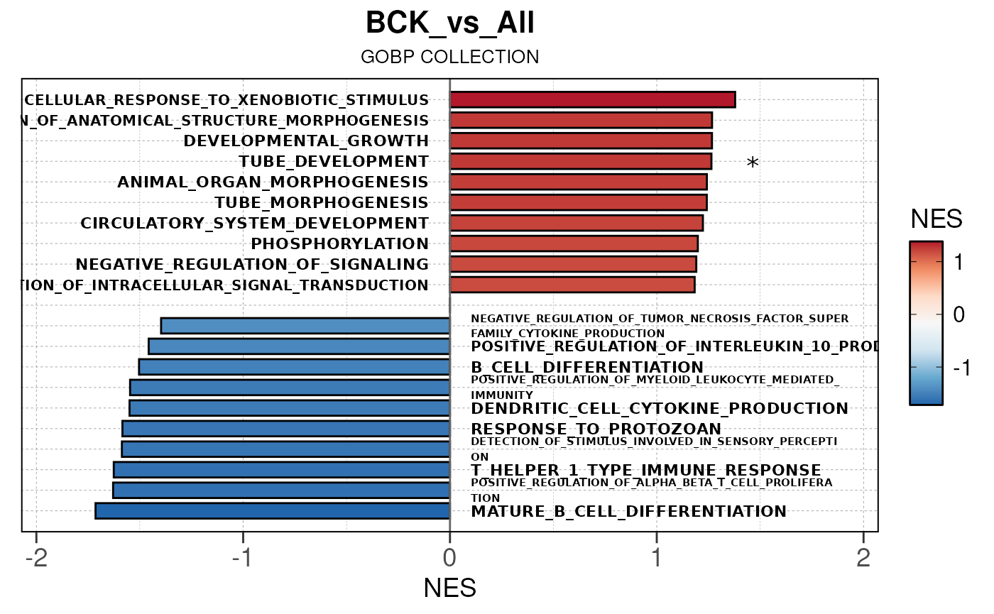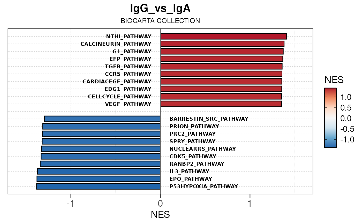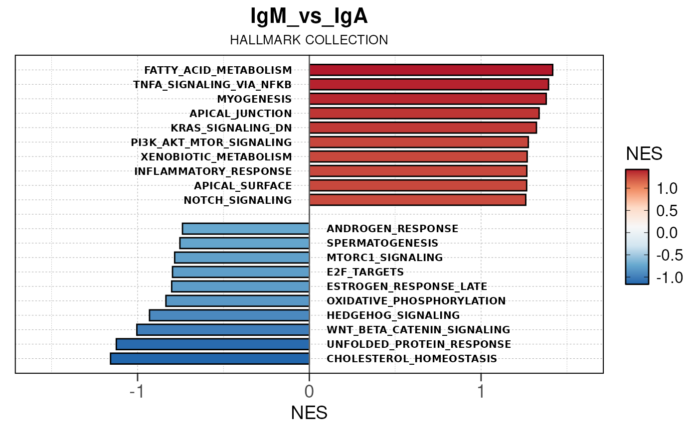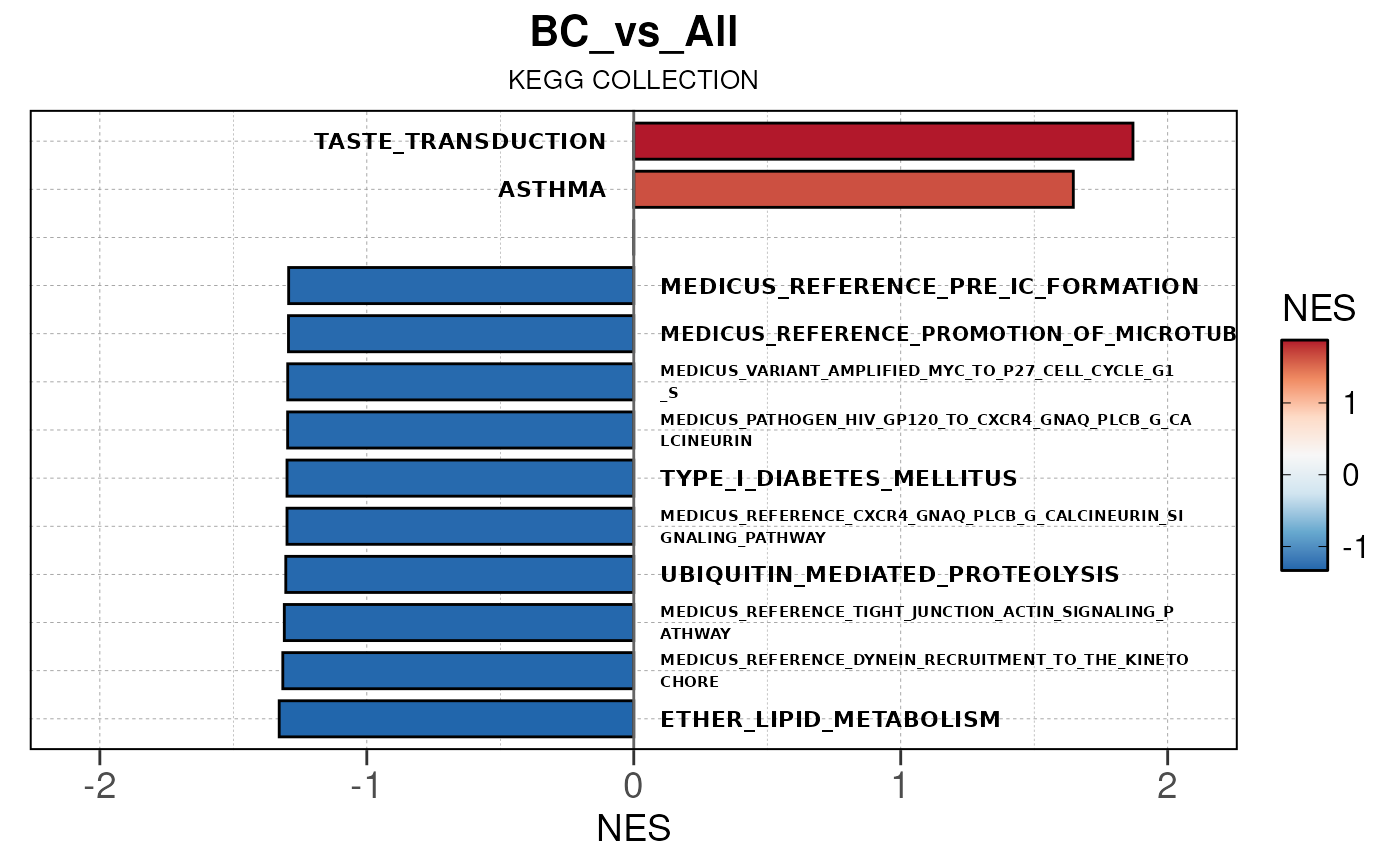 ## WARNING: There were 2 pathways for which P-values were not calculated properly due to unbalanced (positive and negative) gene-level statistic values. For such pathways pval, padj, NES, log2err are set to NA. You can try to increase the value of the argument nPermSimple (for example set it nPermSimple = 10000)