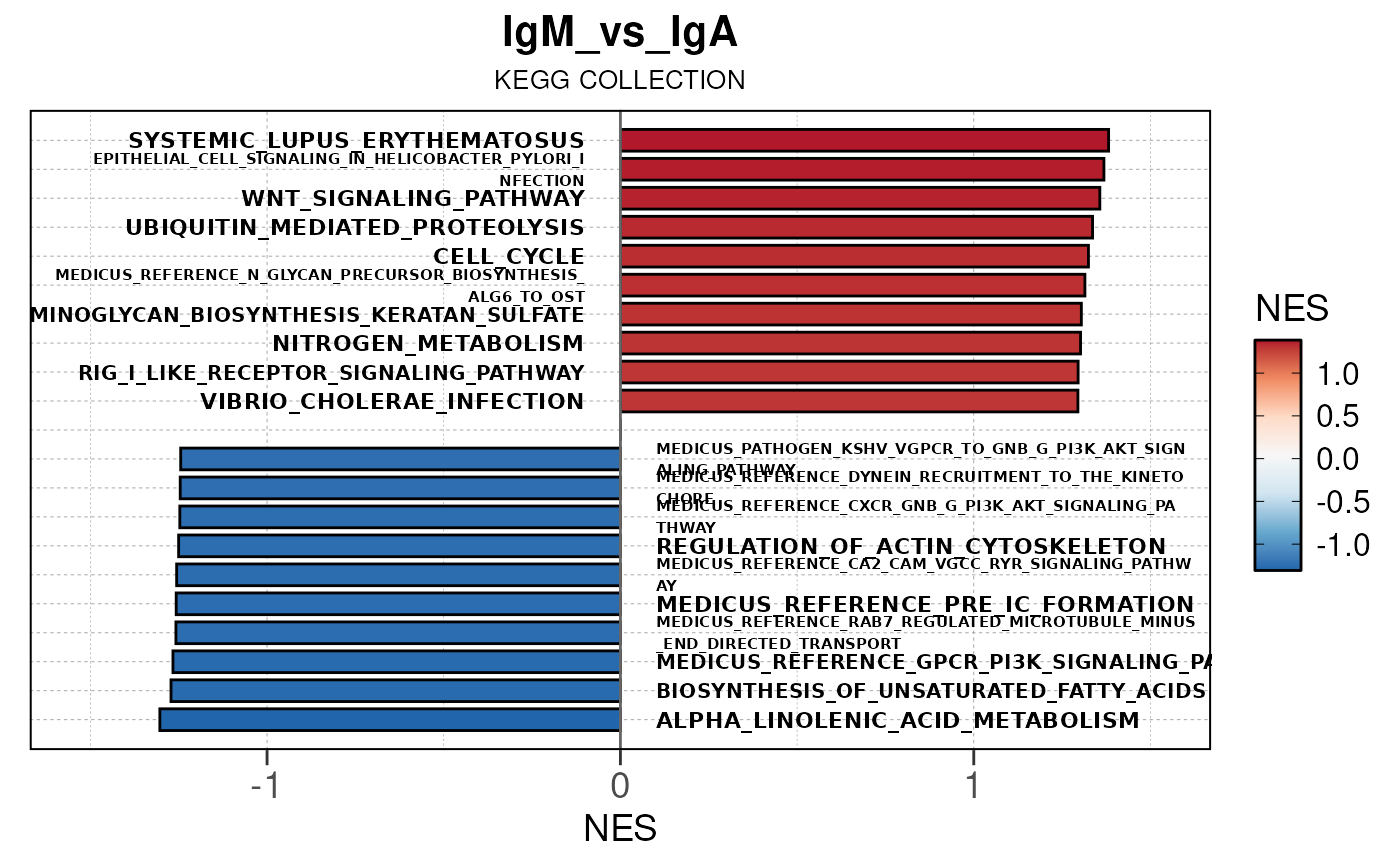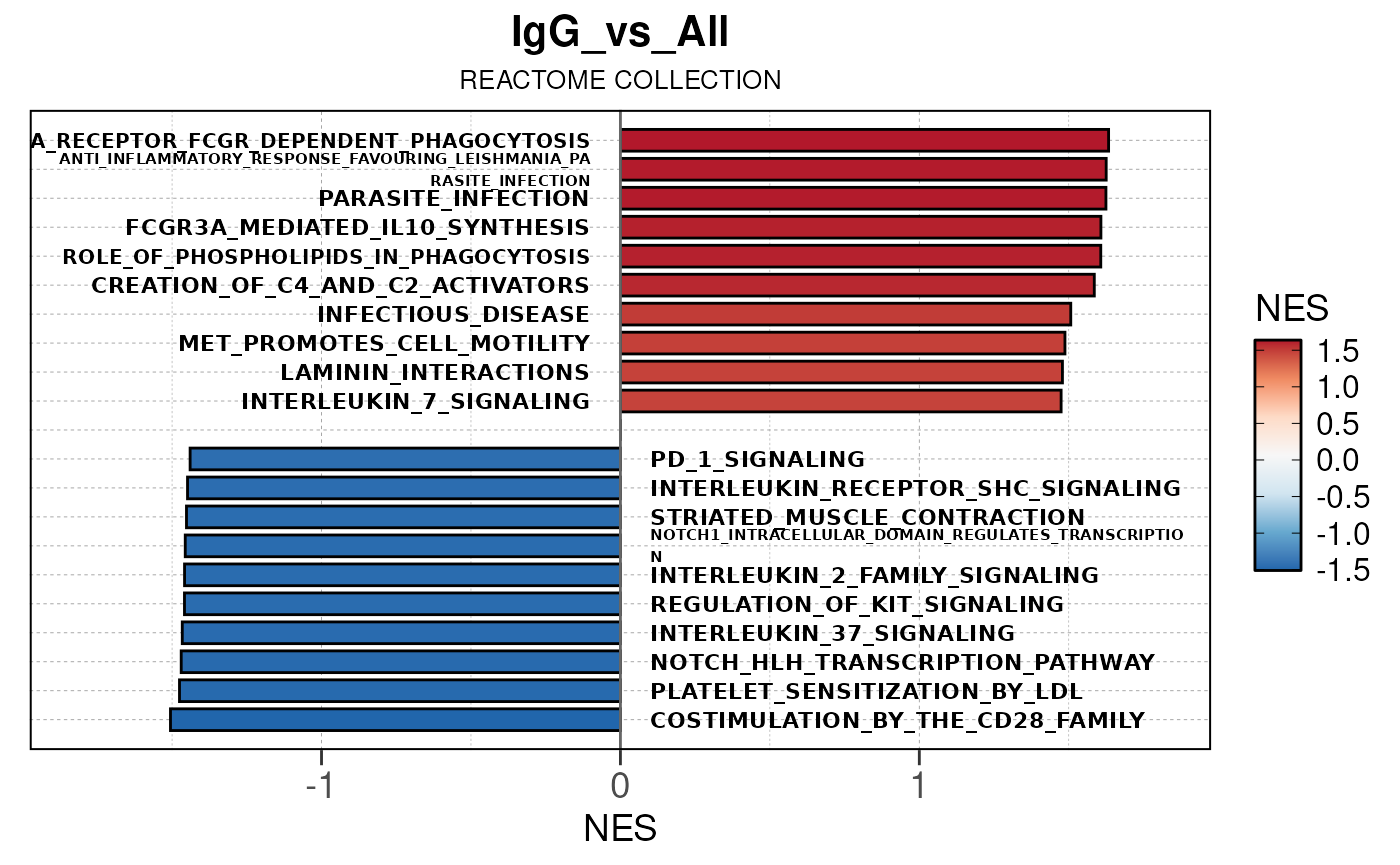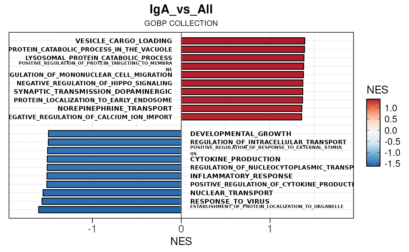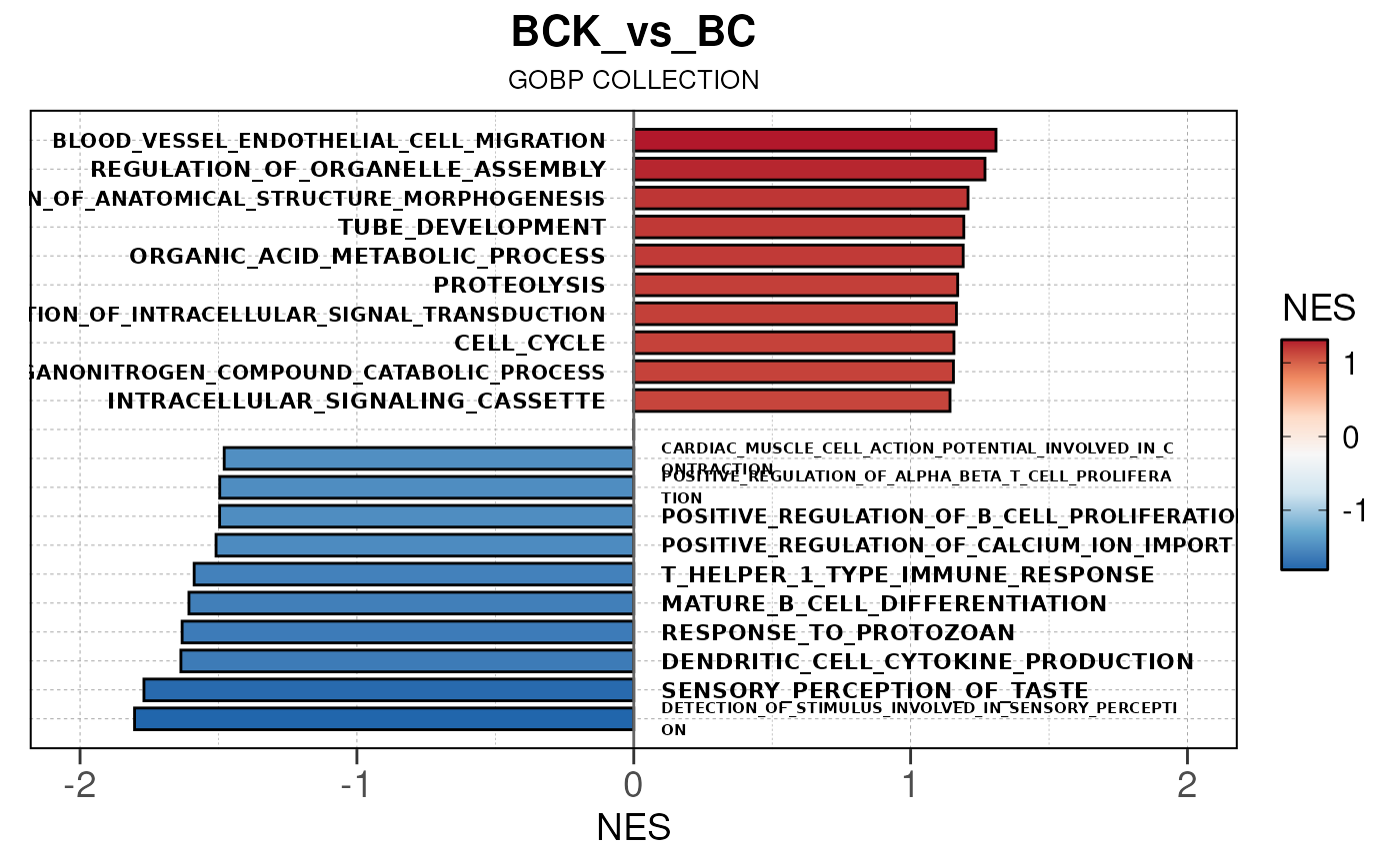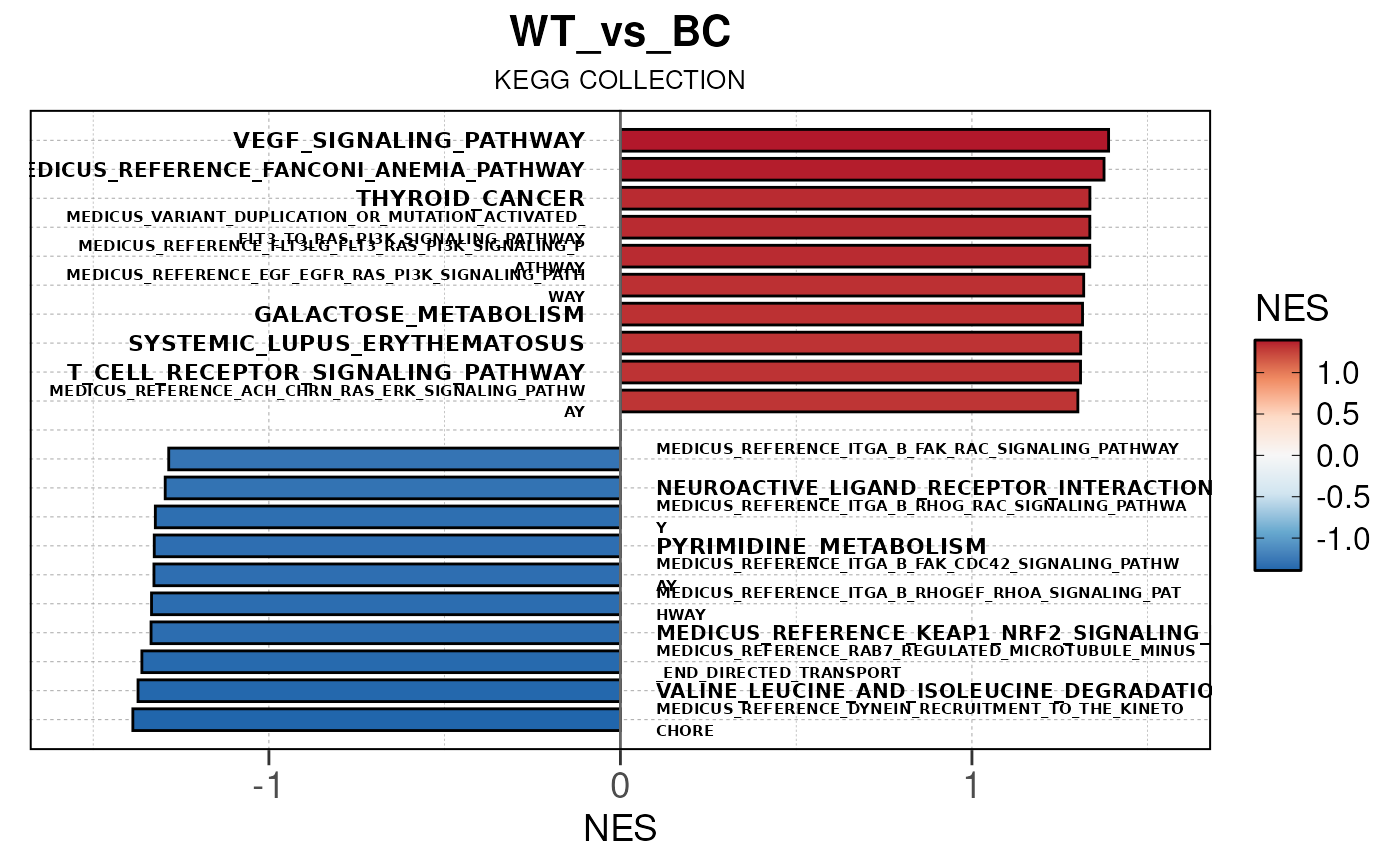 ## WARNING: There were 2 pathways for which P-values were not calculated properly due to unbalanced (positive and negative) gene-level statistic values. For such pathways pval, padj, NES, log2err are set to NA. You can try to increase the value of the argument nPermSimple (for example set it nPermSimple = 10000)