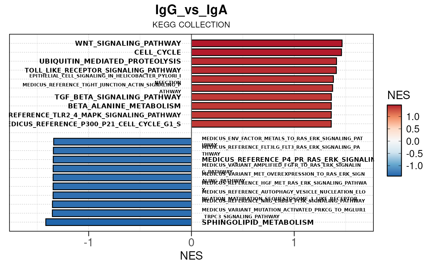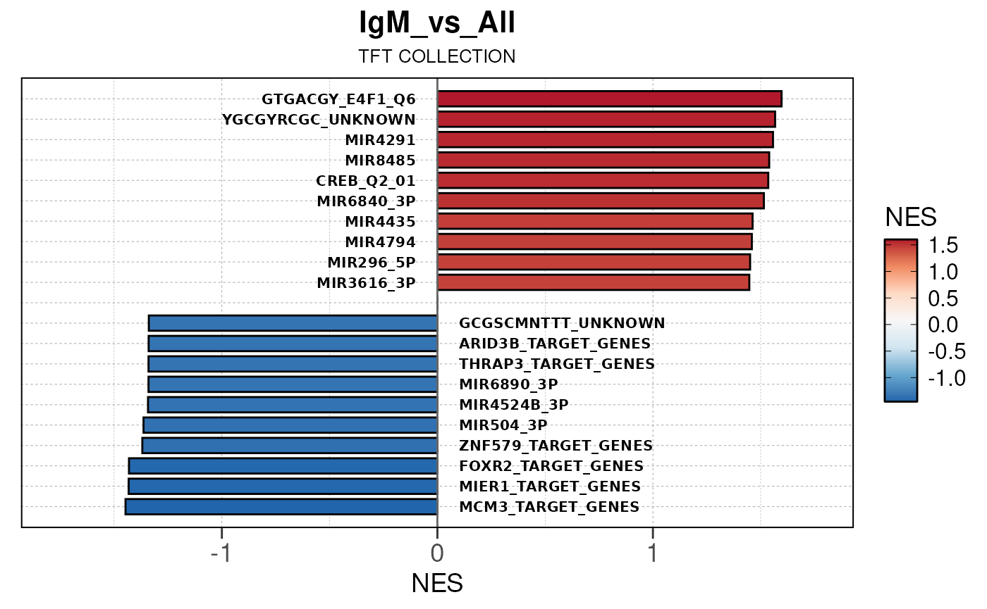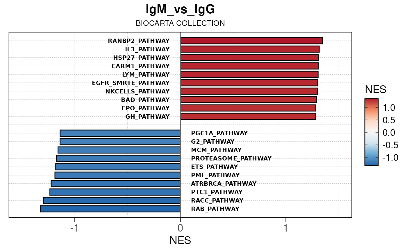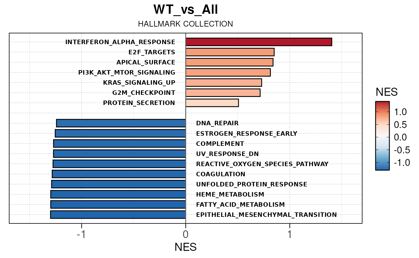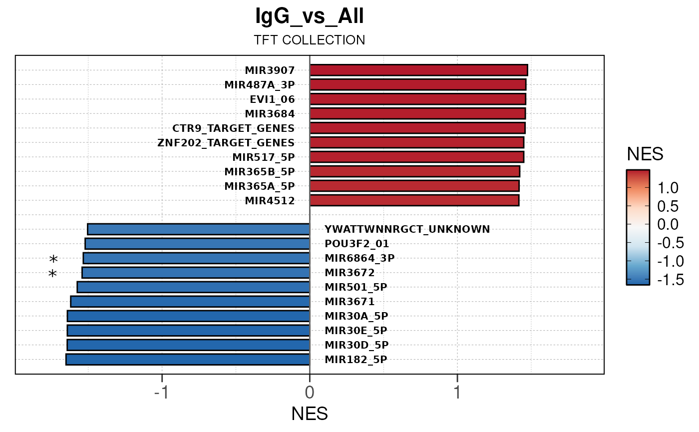 ## WARNING: There were 2 pathways for which P-values were not calculated properly due to unbalanced (positive and negative) gene-level statistic values. For such pathways pval, padj, NES, log2err are set to NA. You can try to increase the value of the argument nPermSimple (for example set it nPermSimple = 10000)