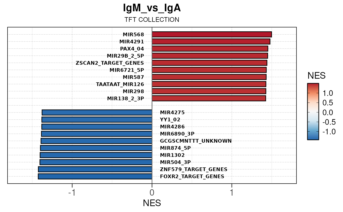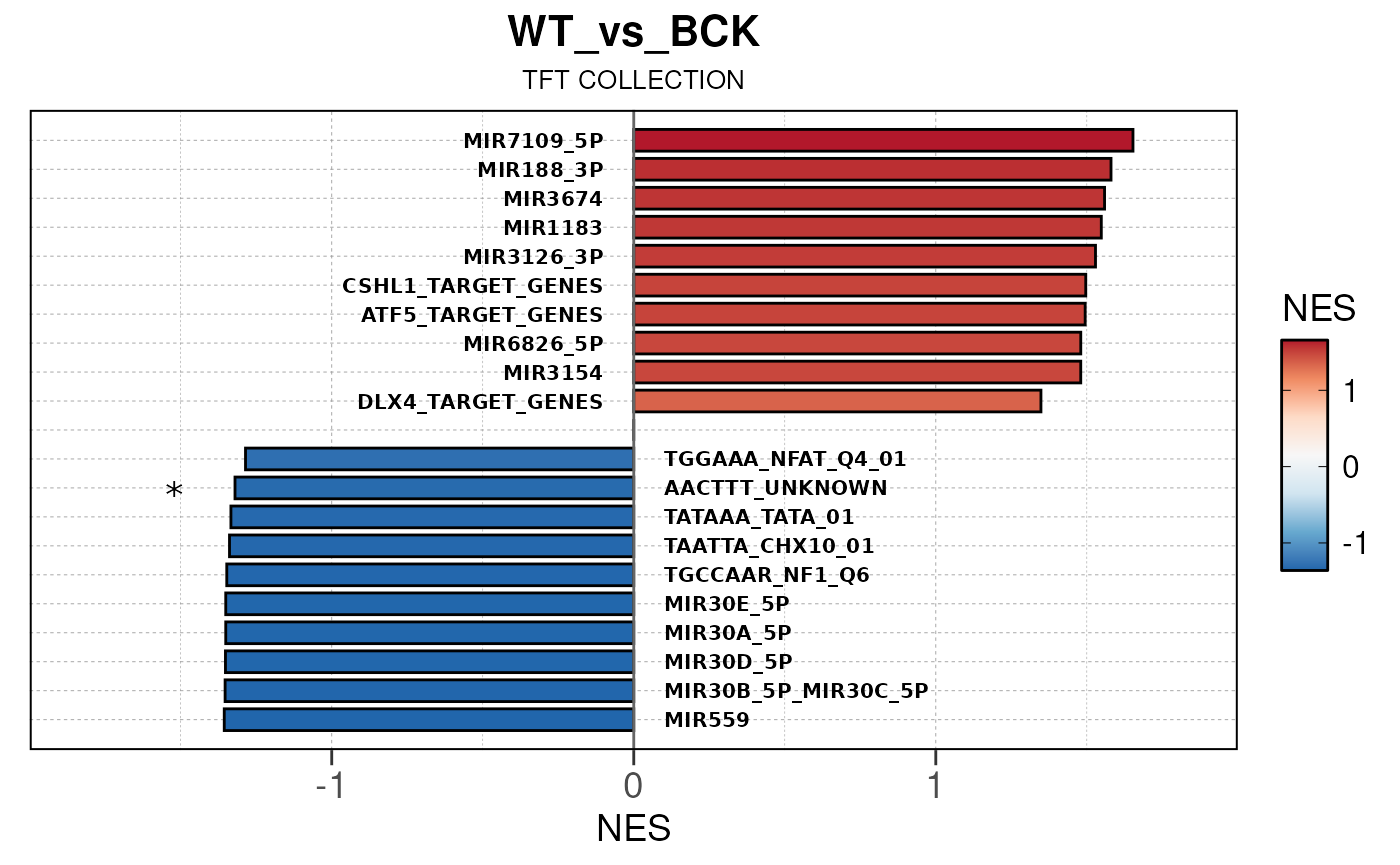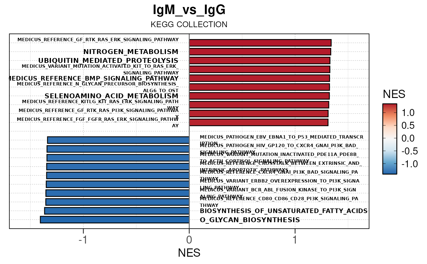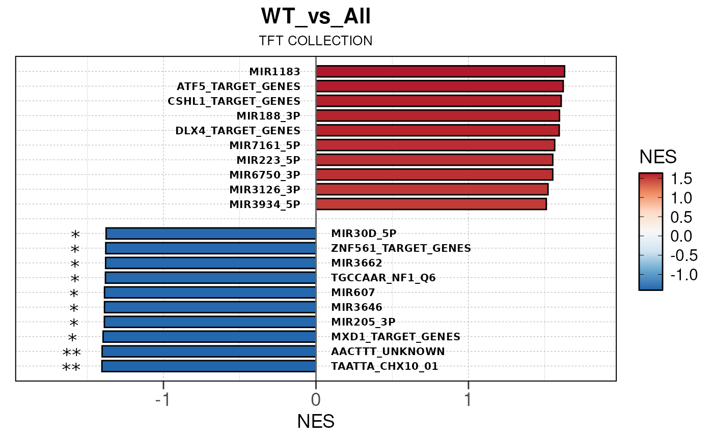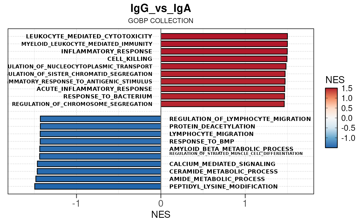## WARNING: There were 2 pathways for which P-values were not calculated properly due to unbalanced (positive and negative) gene-level statistic values. For such pathways pval, padj, NES, log2err are set to NA. You can try to increase the value of the argument nPermSimple (for example set it nPermSimple = 10000)