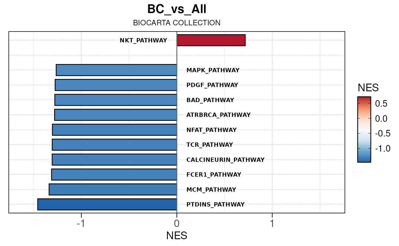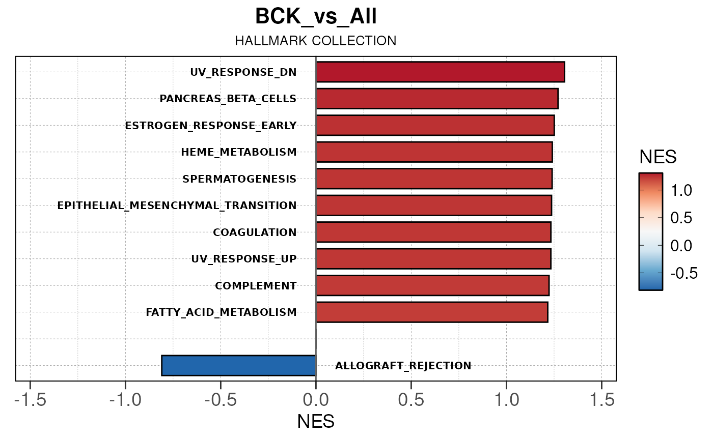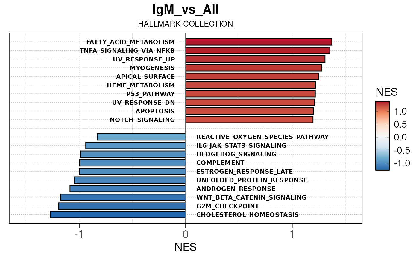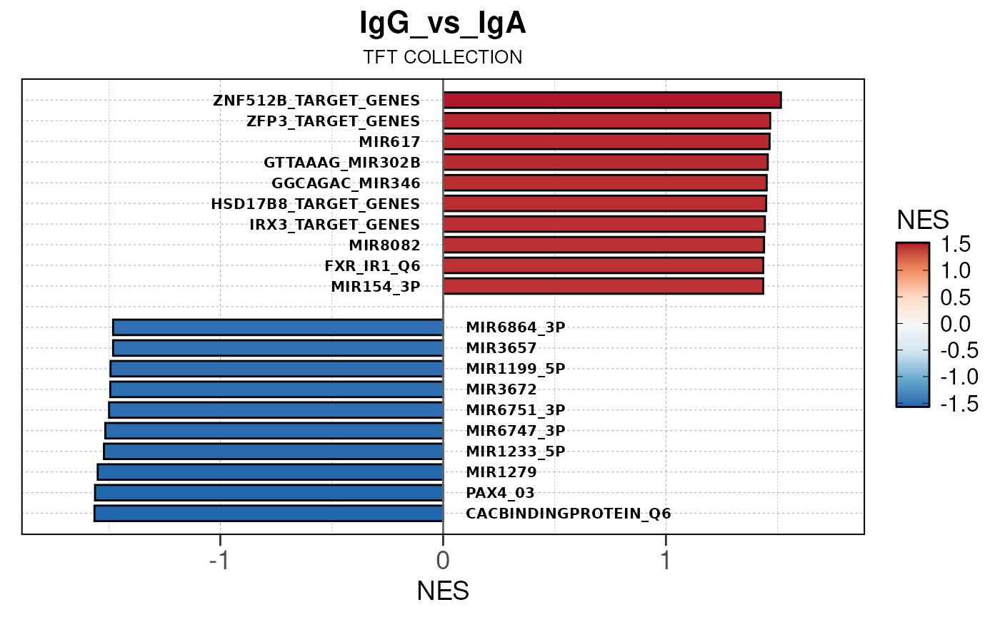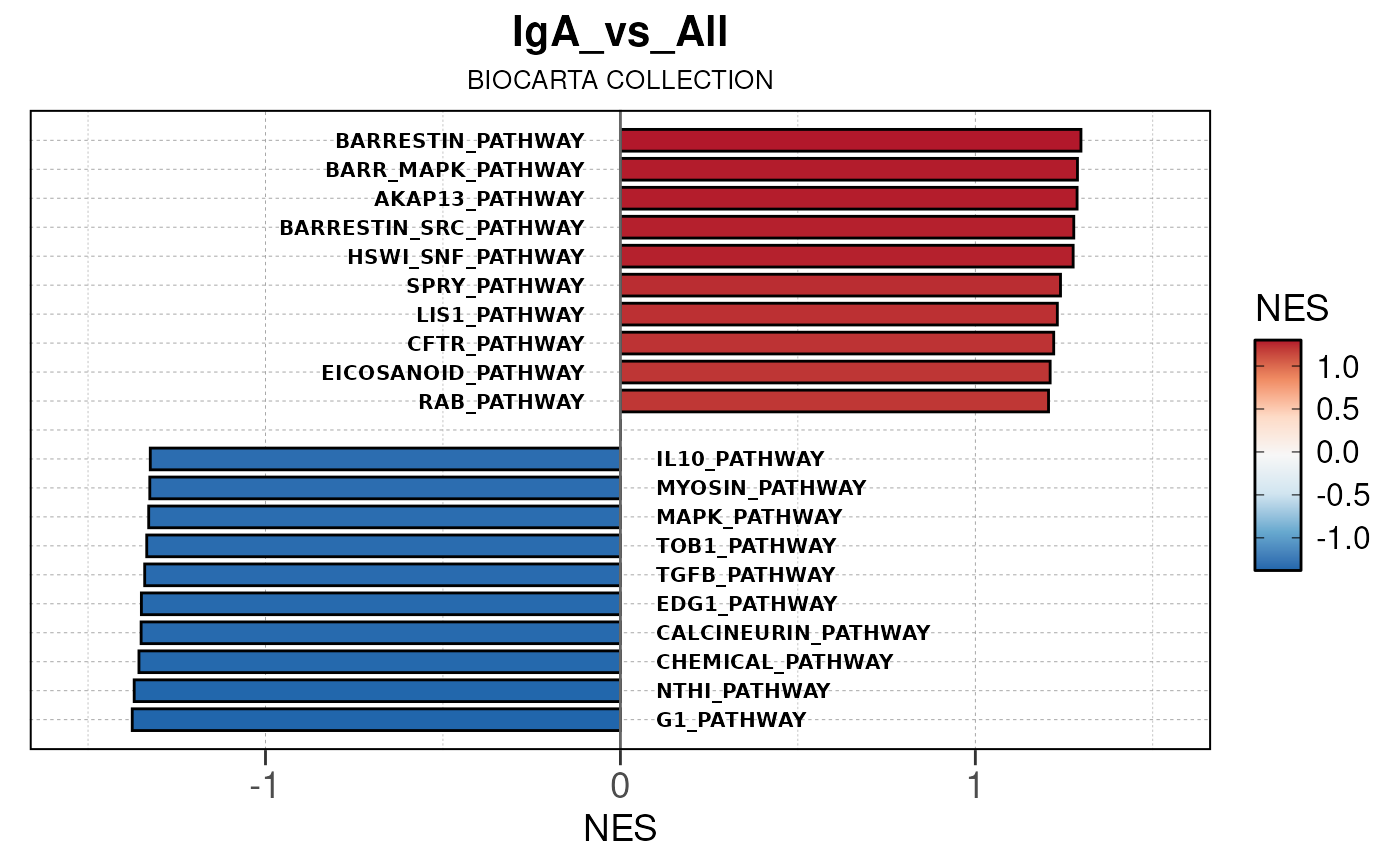 ## WARNING: There were 2 pathways for which P-values were not calculated properly due to unbalanced (positive and negative) gene-level statistic values. For such pathways pval, padj, NES, log2err are set to NA. You can try to increase the value of the argument nPermSimple (for example set it nPermSimple = 10000)