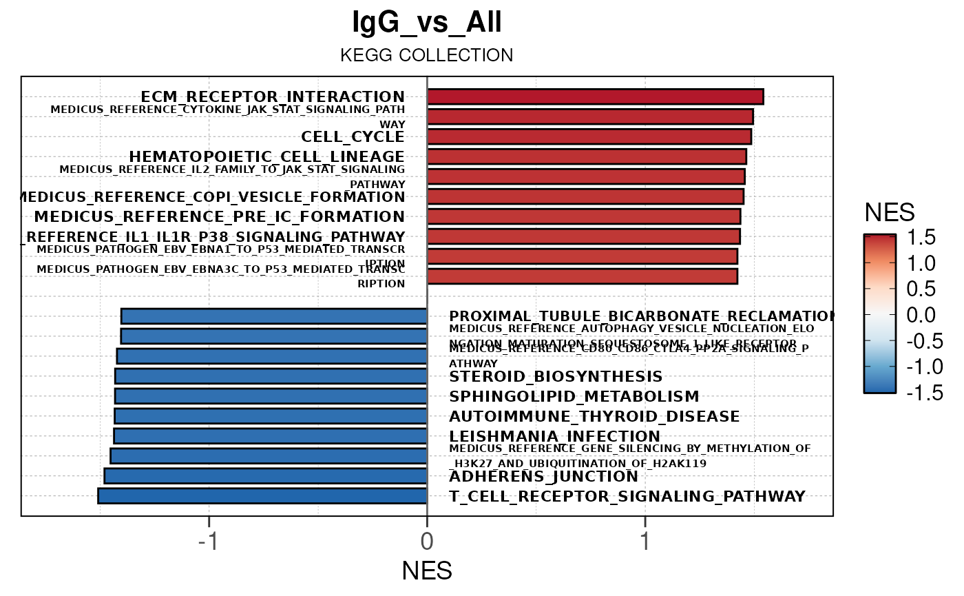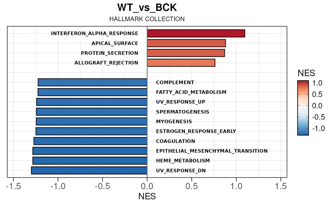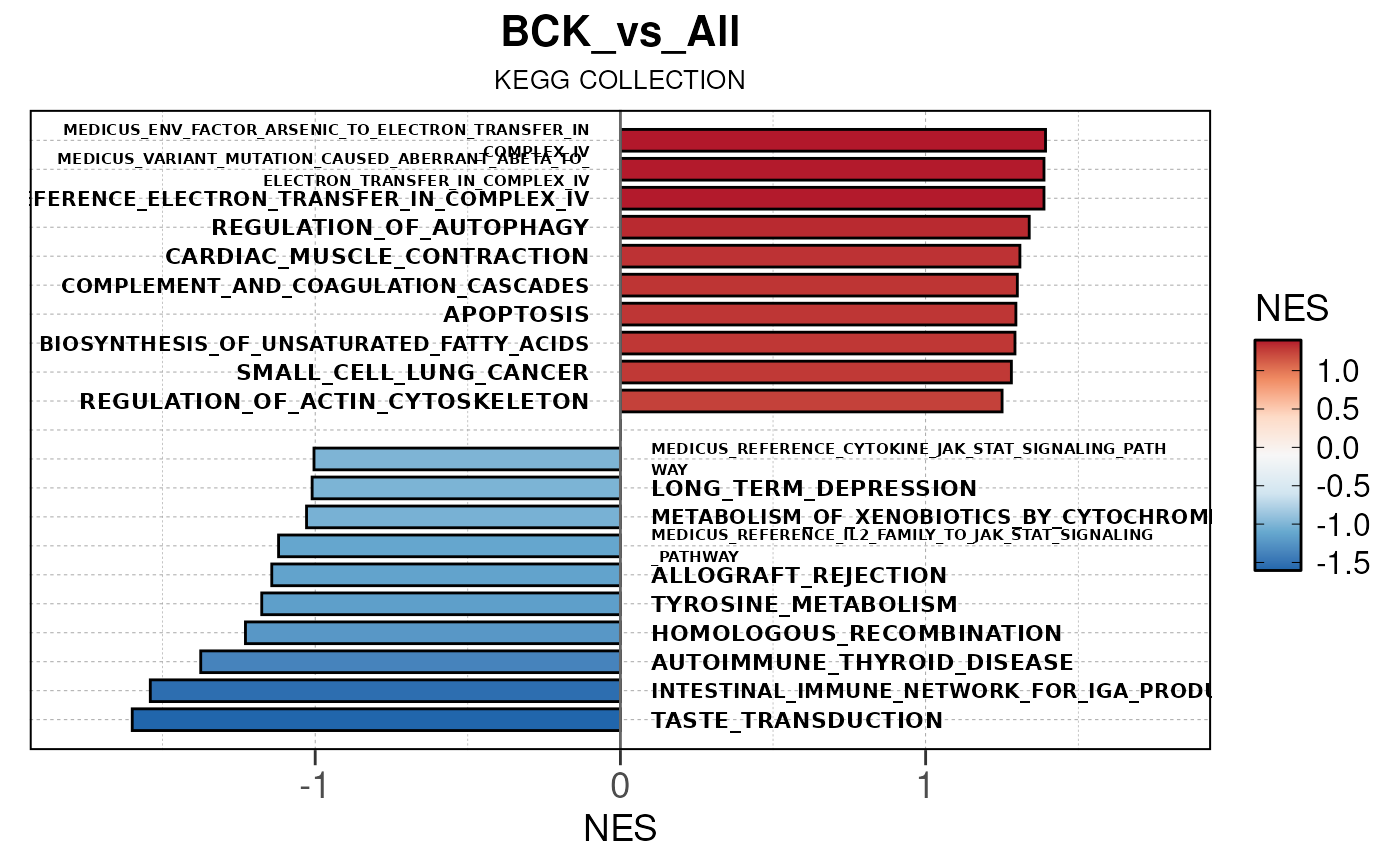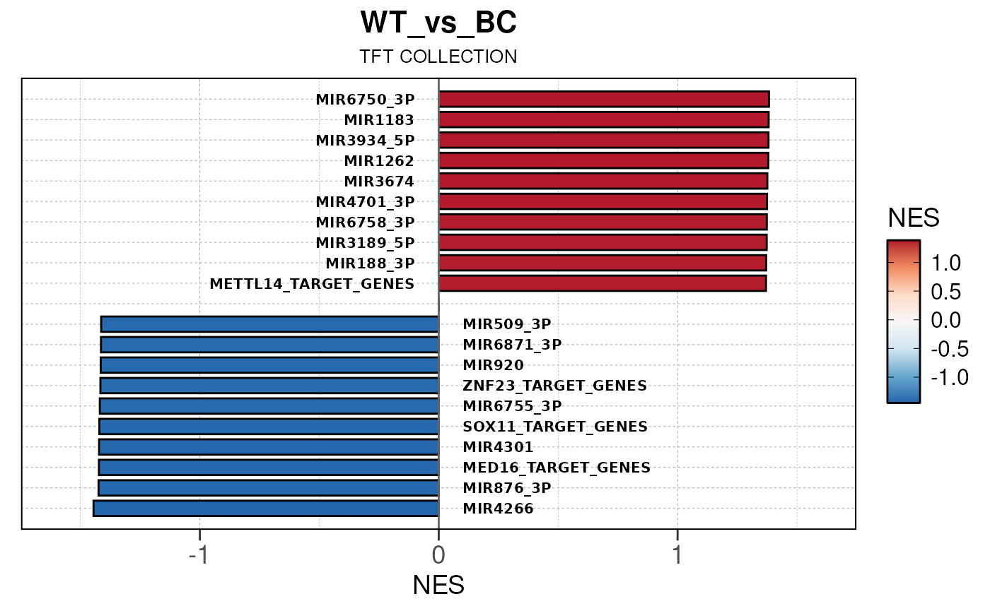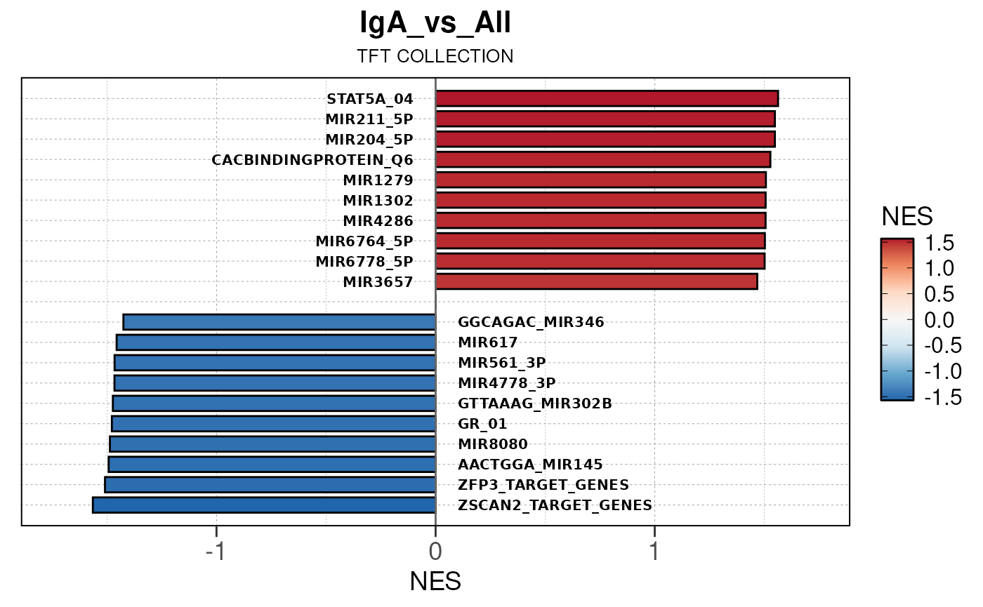 ## WARNING: There were 2 pathways for which P-values were not calculated properly due to unbalanced (positive and negative) gene-level statistic values. For such pathways pval, padj, NES, log2err are set to NA. You can try to increase the value of the argument nPermSimple (for example set it nPermSimple = 10000)