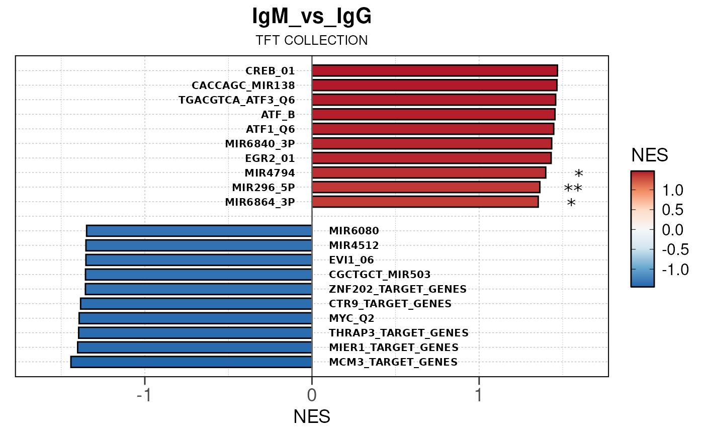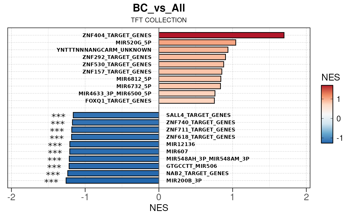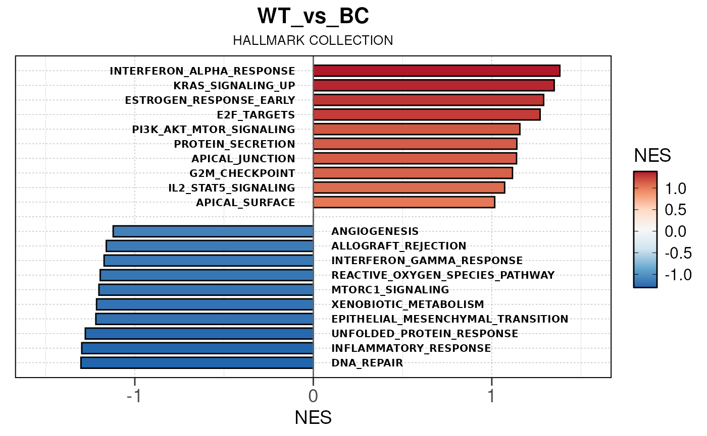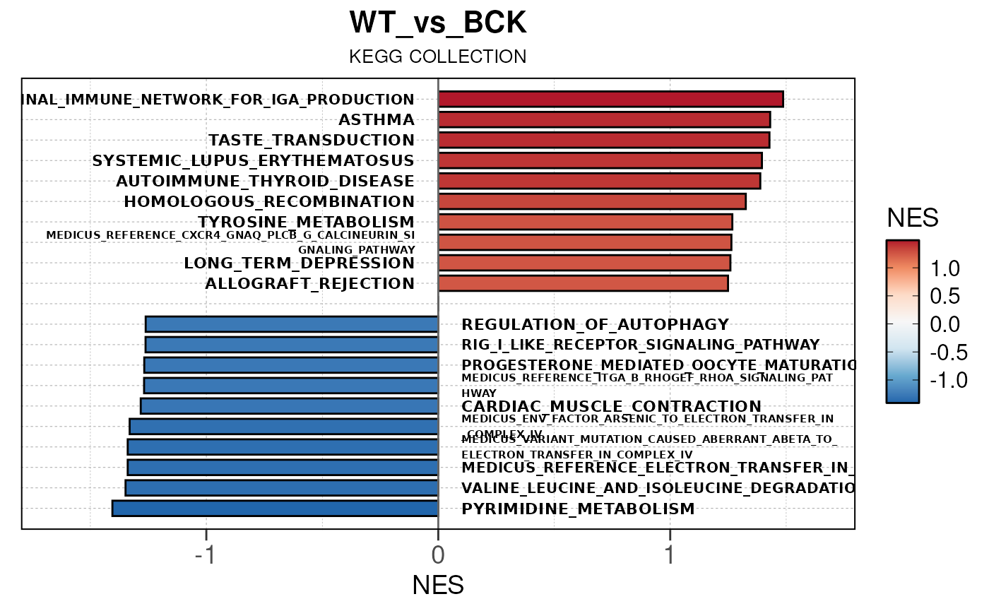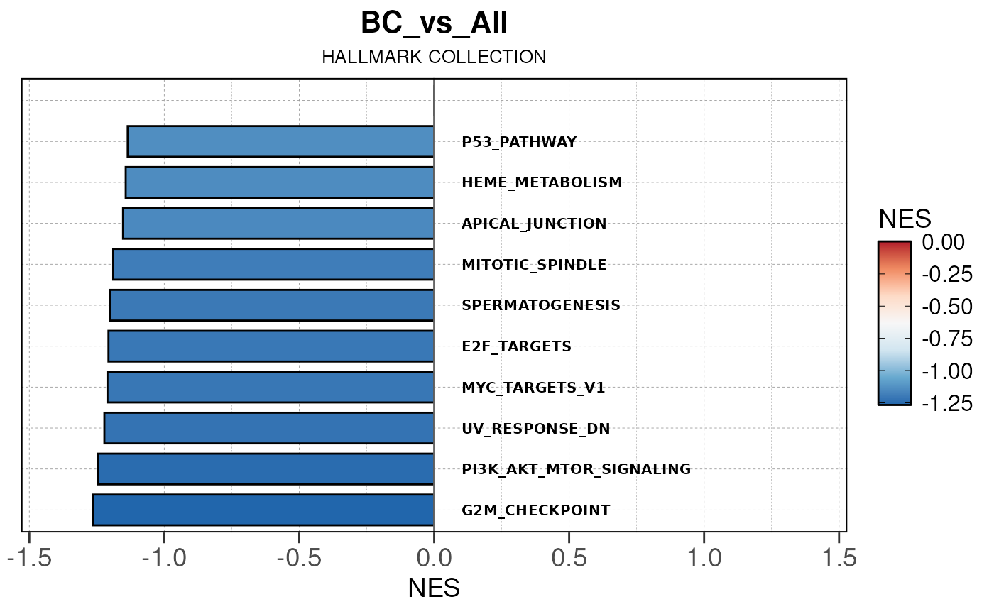 ## WARNING: There were 2 pathways for which P-values were not calculated properly due to unbalanced (positive and negative) gene-level statistic values. For such pathways pval, padj, NES, log2err are set to NA. You can try to increase the value of the argument nPermSimple (for example set it nPermSimple = 10000)